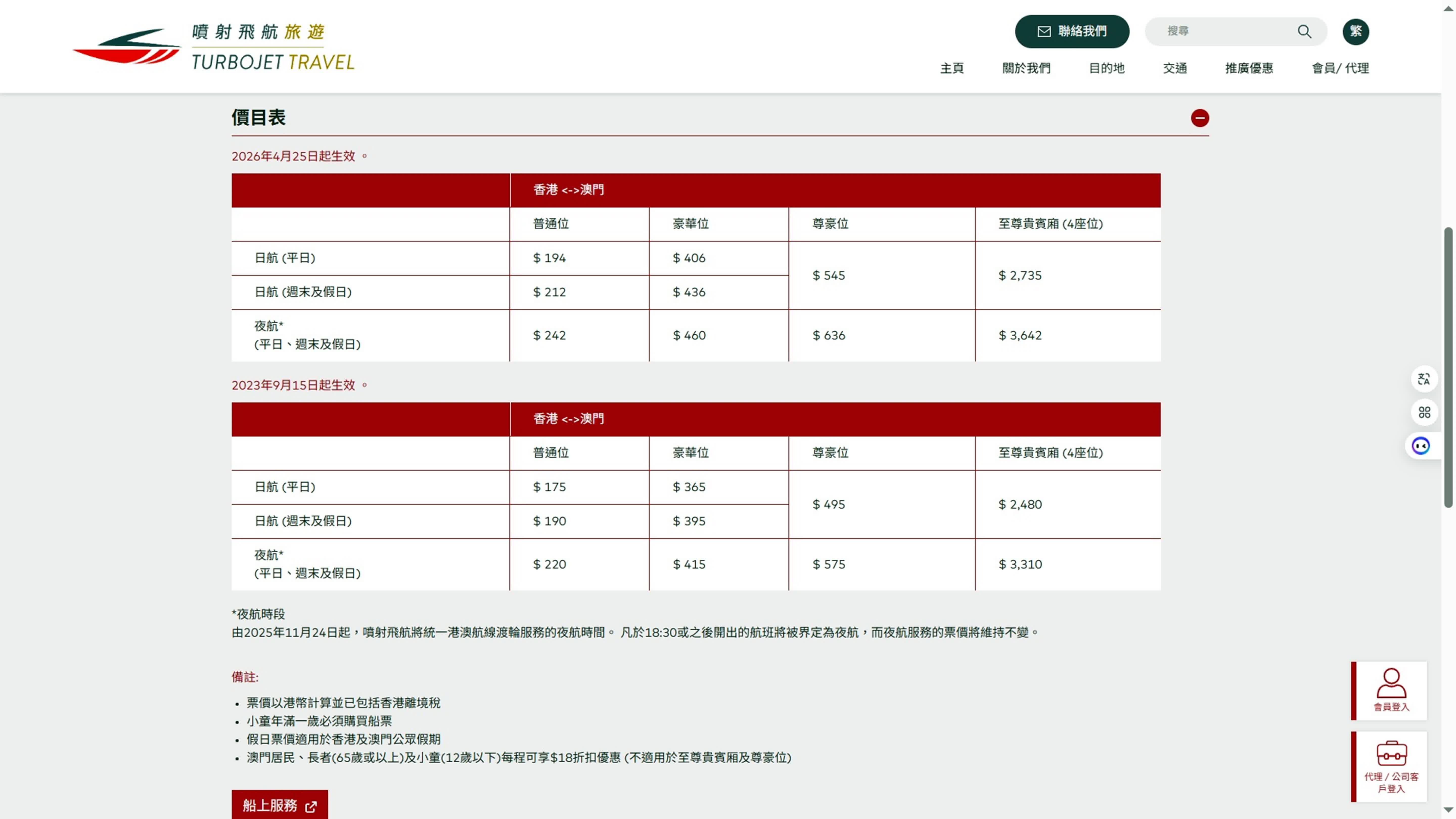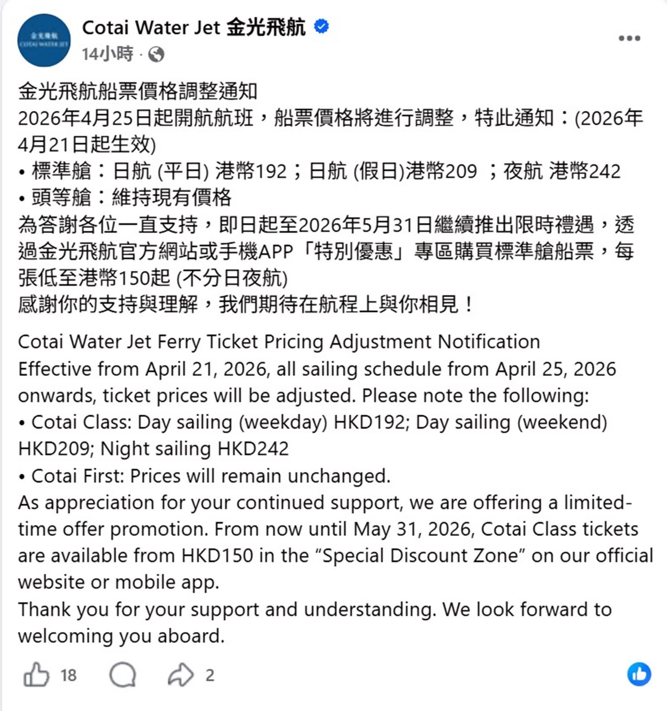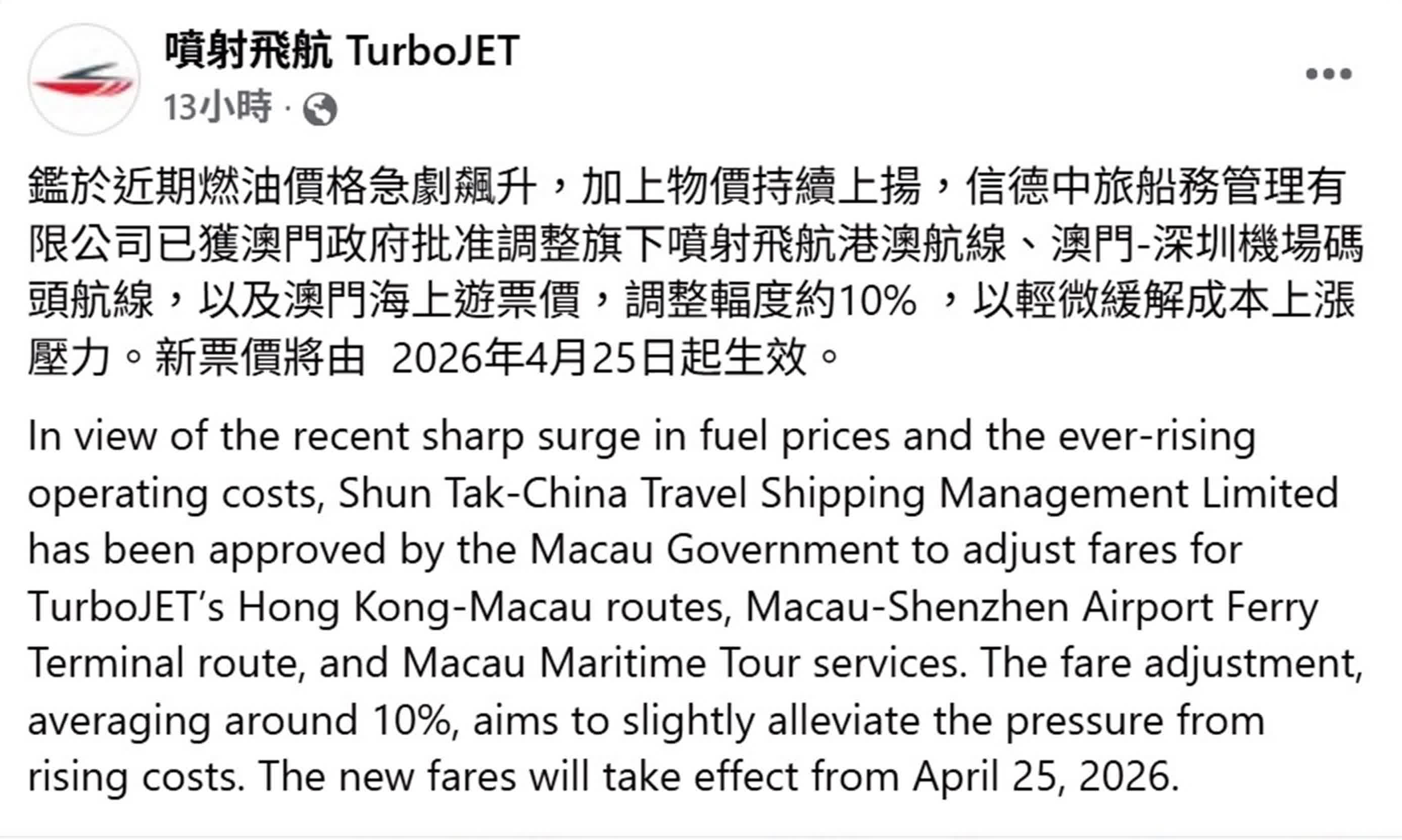 噴射飛航在其FB專頁貼文表示,鑑於近期燃油價格急劇飆升,加上物價持續上揚,信德中旅船務管理有限公司已獲澳門政府批准調整旗下噴射飛航港澳航線、澳門-深圳機場碼頭航線,以及澳門海上遊票價,調整幅度約10%,以輕微緩解成本上漲壓力。新票價將由2026年4月25日起生效。