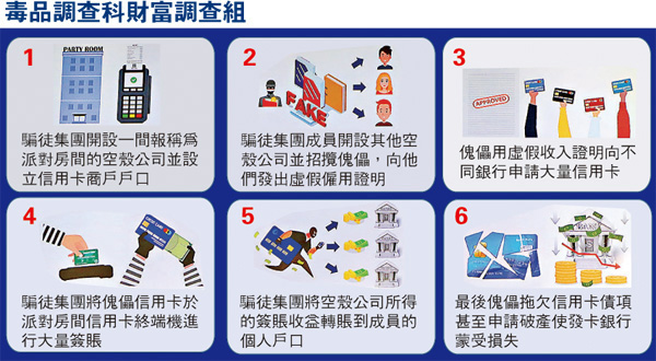 調查發現,該詐騙集團由2019年1月至去年7月期間開設一間空殼公司做派對房間生意,並申請成為信用卡商戶,再成立多家空殼公司,招攬負責碌卡的「傀儡」卡主,向他們提供虛假僱員記錄、收入證明及支薪記錄等,成功向多間銀行申請超過200張信用卡,再在派對房間的信用卡終端機不斷「碌卡」進行虛假簽賬,平均每次簽賬額約4萬港元,最大一宗簽賬約12萬港元。