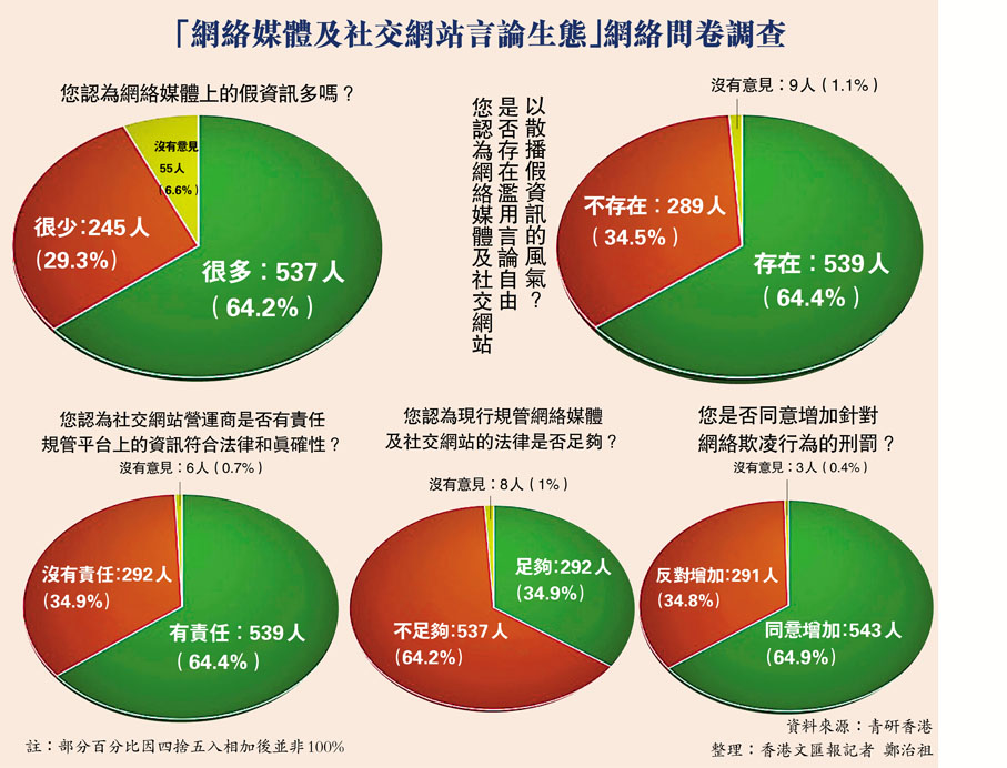 由修例風波開始,以偏概全的資訊甚至假新聞充斥網絡。為了解香港市民對網絡資訊真實性和應對網絡假資訊措施等相關議題的看法,「青研香港」以「網絡媒體及社交網站言論生態」為題進行網絡問卷調查,昨日公布的調查結果發現,逾六成受訪者認為網絡媒體濫用言論自由,不斷發放假資訊,並認為社交網站營運商有責任規管平台上的資訊符合法律和真確性,而現行規管網絡媒體及社交網站的法律不足,要求加強針對網絡欺凌行為的刑罰。●香港文匯報記者 鄭治祖