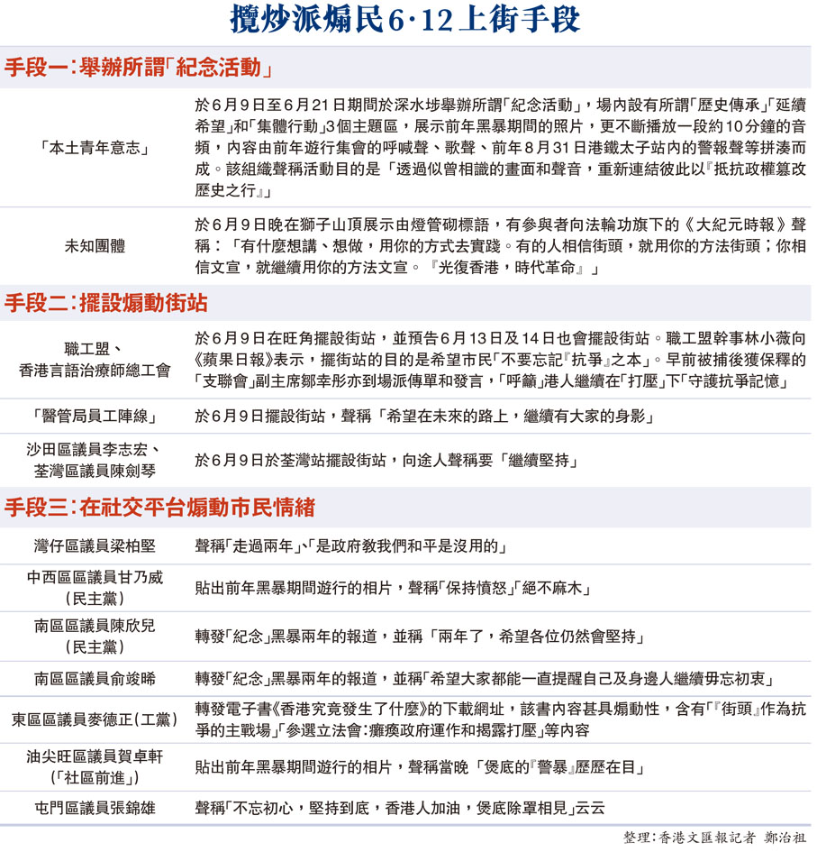 多個攬炒派組織近日以修例風波兩周年的名義,接連以多種方式煽動市民於6月12日(本周六)非法集結。多名區議員更於社交平台貼出修例風波期間的遊行相片,以較婉轉的方式配文暗示市民繼續「抗爭」(見表),企圖令黑暴重現,以爭取自己的政治本錢。