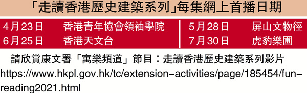 疫情下我們暫時未能遠遊,雖則我們現時未能起程走萬里路,但我們仍可在家中讀萬卷書以增廣見聞。香港有很多歷史建築物,等待我們去了解它們的價值和故事。最近,香港公共圖書館推行網上節目「走讀香港歷史建築系列」,在城市規劃師的帶領下,透過屏幕多角度遊歷香港四大特色建築物,當中亦邀請了故事大使就當集主題向小朋友分享故事和介紹圖書。