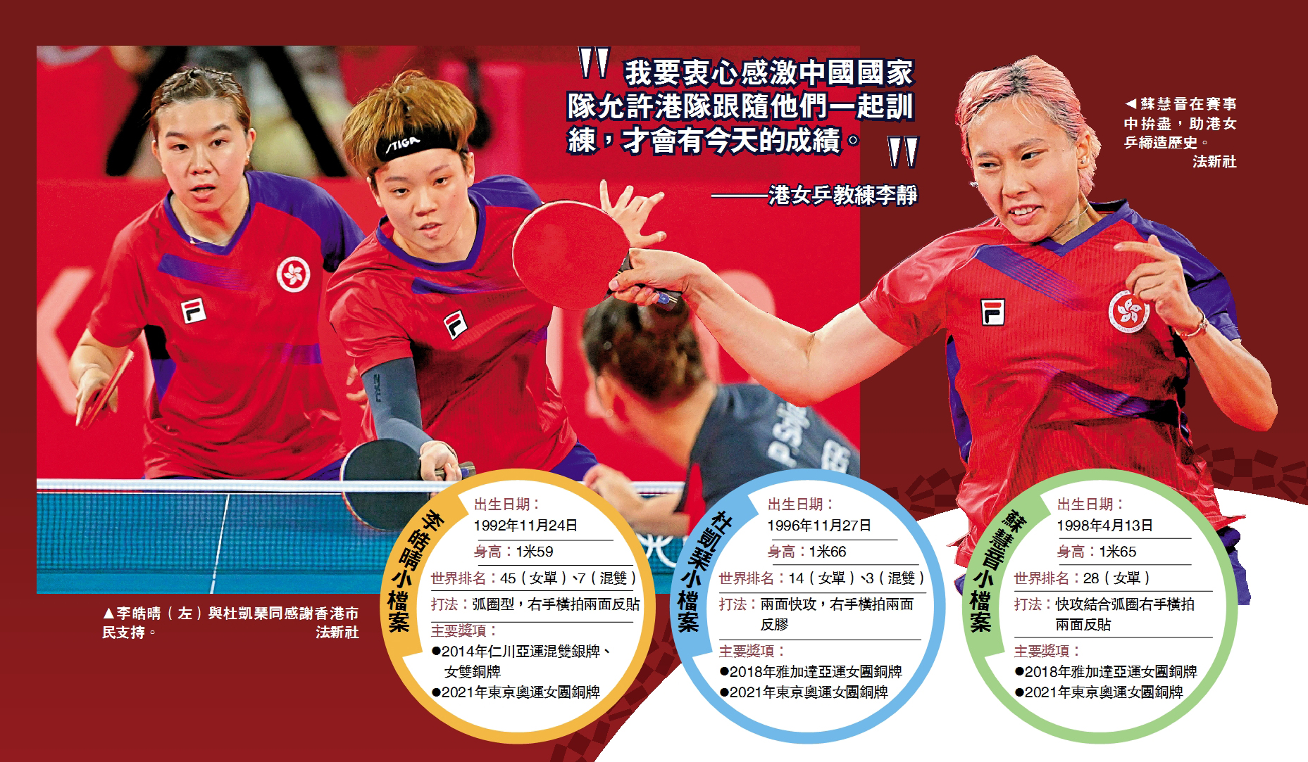 中國香港奧運會代表團昨天歷史上首次一日奪得兩面獎牌,分別是港女乒摘下團體銅牌和劉慕裳勇奪空手道女子個人形銅牌。同日,中國乒乓球女隊直落3場擊敗東道主日本,奪得女團金牌。港女乒教練李靜賽後衷心感激中國國家隊允許港隊跟隨他們一起訓練,才會有今天的成績,亦衷心感謝香港市民對港隊的支持。在頒獎禮上,中國女乒和中國香港女乒同時站在奧運領獎台上,東京奧運賽場上奏響國歌,中國國旗和香港特區區旗同時升起。