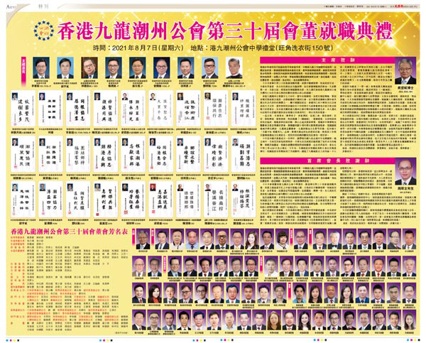 今日本會假屬校港九潮州公會中學禮堂,隆重舉行第三十屆會董就職典禮,承蒙主禮嘉賓百忙之中抽空蒞臨主禮,又得多位中聯辦領導、特區政府官員、各界賢達、社團首長等蒞臨指導,良朋滿座,濟濟一堂,本人再次代表香港九龍潮州公會全體同仁向各位致以衷心的感謝!