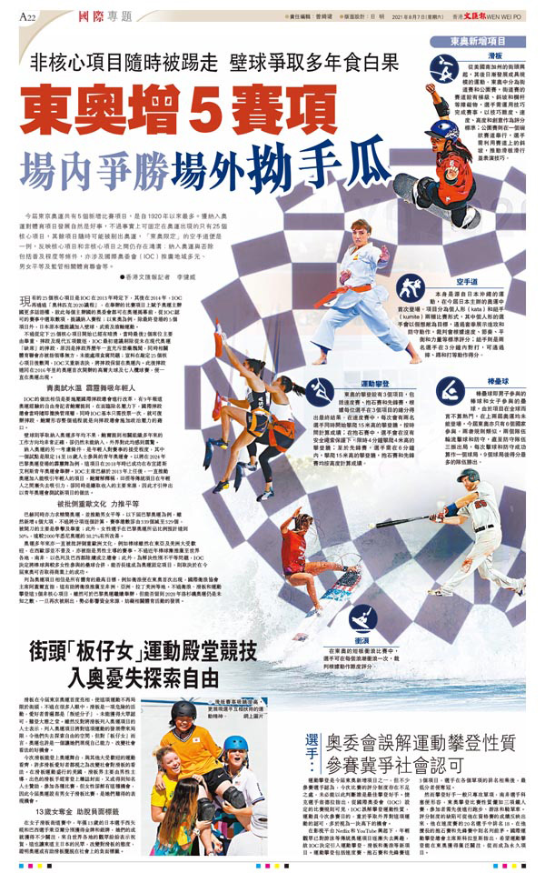 今屆東京奧運共有5個新增比賽項目,是自1920年以來最多。獲納入奧運對體育項目發展自然是好事,不過事實上可固定在奧運出現的只有25個核心項目,其餘項目隨時可能被剔出奧運,「東奧限定」的空手道便是一例,反映核心項目和非核心項目之間仍存在鴻溝;納入奧運與否除包括普及程度等條件,亦涉及國際奧委會(IOC)推廣地域多元、男女平等及監管相關體育聯會等。 ●香港文匯報記者 李健威