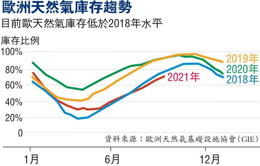 根據歐盟統計局資料,石油是歐洲主要燃料來源,接下來是天然氣,以及裝置量持續增加的再生能源和生質燃料。這一波歐洲能源危機有幾個成因,首先是去年冬天北半球廣泛地區錄得較以往低溫,歐洲動用了大量能源儲備作發電及供暖,適逢新冠疫苗面世後各地疫情趨緩,經濟復甦帶動能源需求增加,令歐洲與亞洲國家爭相向美國、挪威及俄羅斯等主要天然氣產地「搶氣」,然而美挪俄本身同樣面臨儲備不足,難以滿足所有需求,令氣價持續飆升。