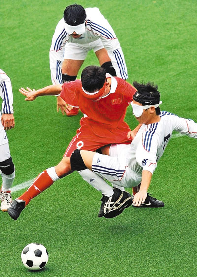以發聲皮球為導向的五人制男子足球賽,中國隊(紅衫)以3:0橫掃日本。中國盲人足球隊在08年的殘奧會決賽不敵巴西屈居亞軍。■新華社