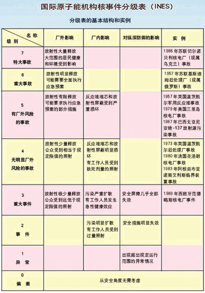 核工業規範嚴謹,任何異常事件均會按照分級表作分析及分類。分級表將事件分為7級:1—3級稱之為「事件」;4—7級稱之為「事故」。無安全意義的事件被劃分為「分級表以下/0級」。對於在輻射或核安全方面沒有安全相關性的事件,分級表沒有對它們進行定級。