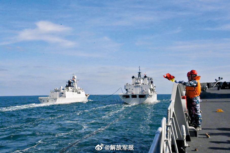 近日,北部戰區海軍某驅逐艦支隊組織多艘艦艇奔赴預定海域開展實戰化訓練。在持續多天的訓練中,編隊組織開展主副炮射擊、航行補給、損害管制、聯合搜救、艦機協同搜攻潛等十餘個課目演練,有效提升了編隊指揮和協同作戰能力。 圖/文:解放軍報微博