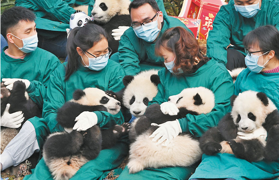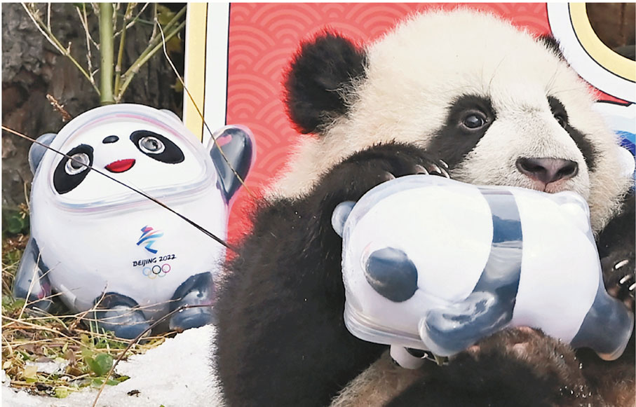 24日,中國大熊貓保護研究中心20隻2021年出生的大熊貓寶寶在四川臥龍神樹坪基地集體亮相賀新春,迎冬奧。圖為大熊貓寶寶與北京冬奧會吉祥物「冰墩墩」。◆文/圖:中新社