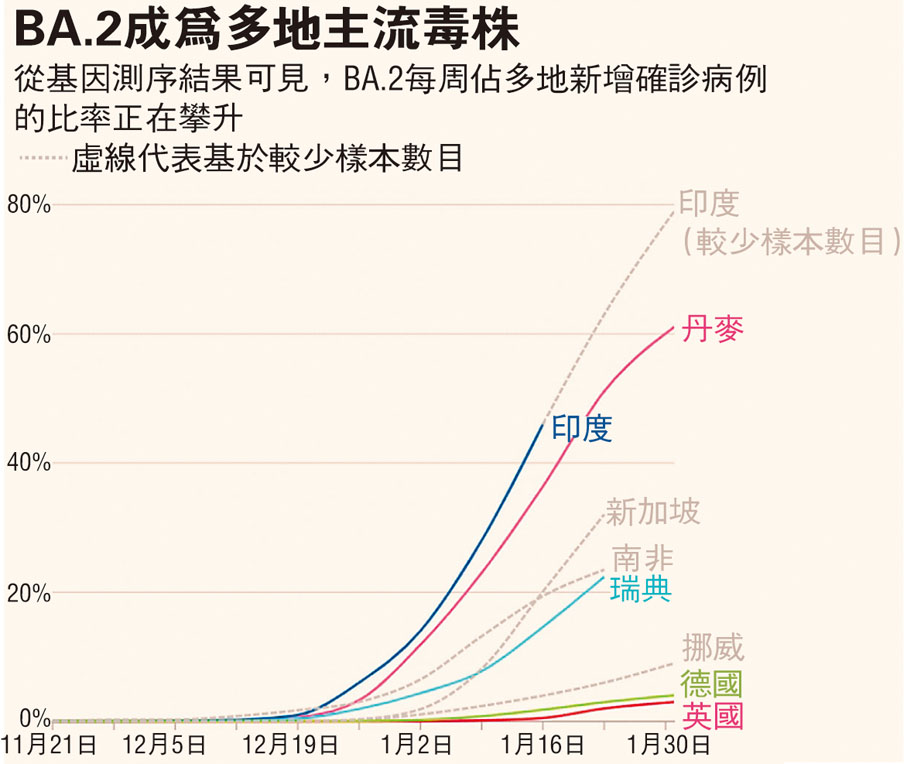 新冠病毒Omicron變種的亞變種「BA.2」已在57個國家和地區出現病例,在丹麥、印度和南非更成為主流毒株,本港葵涌邨逸葵樓的感染群組也是由BA.2引發。由於BA.2傳播力較Omicron原始毒株「BA.1」高三成,威脅不容忽視,英國《金融時報》便綜合現時所知資訊,解構BA.2特性: