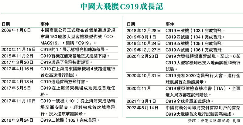 首架將交付C919大飛機試飛成功
