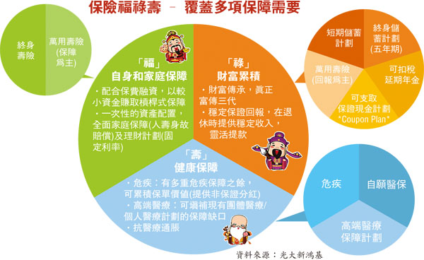 我們是次將提出稱為「福祿壽」的概念,當中包括了保險產品的3大範疇:「福」是指自身及家庭保障,相關產品包括終身壽險,以及部分以保障為主的萬用壽險等。此類產品除提供固定利率的回報外,更重要的是可提供全面性的家庭保障。投保人更可配合保費融資,以較少資金獲取槓桿式的保障。至於「祿」是指財富累積,產品例子為終身或短期儲蓄計劃,以及坊間較少介紹,而過去本專欄曾經論述的可支取保證現金計劃(Coupon Plan)等方案。透過穩定的保證回報,讓投保人在退休時可獲得穩定收入,並可用作財富傳承,做到富傳三代。