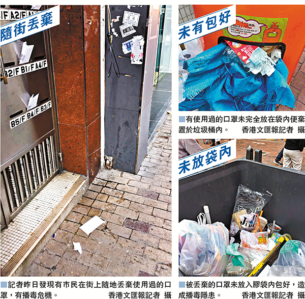 不過,巿民通街丟棄曾使用口罩的情況轉趨嚴重,不時可見到使用過的口罩遭胡亂棄置在街道上或垃圾桶旁。