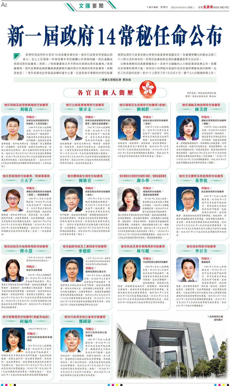 香港特區政府昨日宣布14名高層官員任命。候任行政長官李家超此前表示,自己上任後第一件事是着手市民最關心的房屋問題,現任運輸及房屋局常任秘書長(房屋)/房屋署署長王天予將出任房屋局常任秘書長/房屋署署長,現任政策創新與統籌辦事處總監何珮玲將出任發展局常任秘書長(規劃及地政)。青年政策也是李家超政綱的重中之重,民政及青年事務局的常任秘書長將由現任行政長官辦公室常任秘書長林雪麗出任。負責備受關注的基本法第二十三條立法的保安局,其常任秘書長將由現任廣播處長李百全出任。