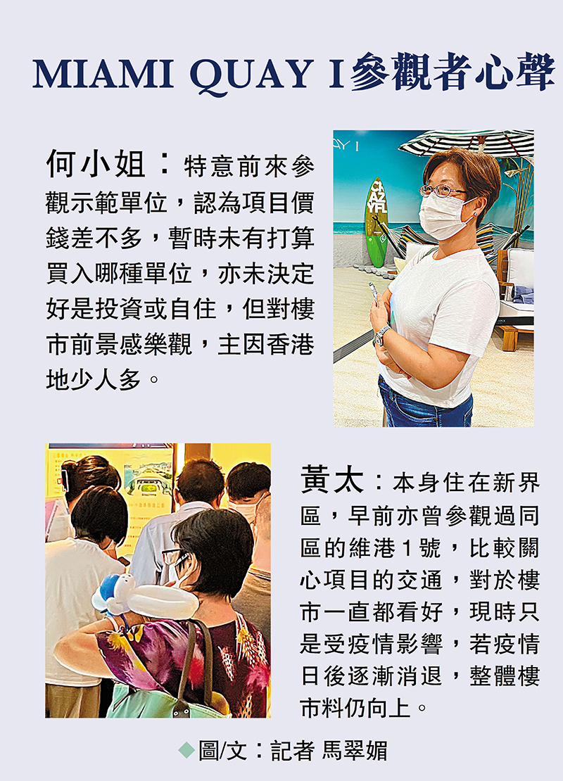 他又稱,MIAMI QUAY I參觀人士中,逾50%來自九龍區,尤其是九龍東居住或工作人士,亦有不少來自港島東及中半山;其餘25%來自新界區,主力為荃灣及沙田。入票人士中,以家庭客為主,對一房及兩房有興趣,相信是因為一房及兩房定價分別約660萬元及低於1,000萬元水平;亦不乏投資客,佔約20%至30%,大部分為曾入購會德豐及合作發展商的項目。此外,項目亦收到不少醫護專業人士及金融專才查詢,希望進駐PARK PENINSULA。該盤展銷廳亦舉辦周末MIAMI主題派對,提供實況互動划艇遊戲及MIAMI復古車打卡位之餘,更特設中秋節慶工作坊,吸引「一家大細」睇樓客參加。