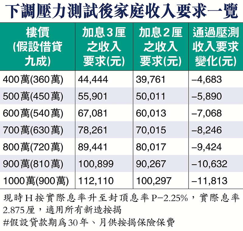 本港樓市今年以來「跌跌不休」,差估署指數首7月累跌約4.5%,港銀日前近4年來首度上調最優惠利率(P),樓市負面氣氛籠罩,政府終出招穩定樓市。金管局昨日宣布即時起將物業按揭貸款利率壓力測試要求由原加3厘,下調至加2厘,以樓價500萬元借九成為例,壓力測試之家庭收入要求由原55,901元減至50,011元,降低約10.5%。意味今後同一收入的人士能負擔更高的樓價,選擇也變相增加,相當於變相「減辣」。