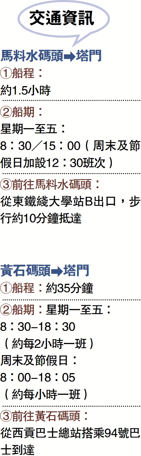 ②船期:星期一至五:8:30/15:00(周末及節假日加設12:30班次)