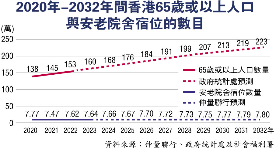 人口老化是目前全球先進經濟體正面對的挑戰,仲量聯行昨發表研究指出,香港於2050年將成為全球人口老化程度最高的城市,預期到2032年,本港65歲或以上老年人口將增加46.3%,至220萬,惟現存7.42萬個安老院舍宿位的供應同期僅增加0.24%,屆時將缺乏超過6萬個長者居所。目前以觀塘區安老院舍的宿位短缺問題最嚴重,平均41名長者爭一個床位。鑑於本地長者更長壽和更富經濟能力,該行認為,香港可以尋找安老院舍外的其他選項,例如樂齡居所,而且市場上樂齡房屋的回報率較一般房屋高,該行建議政府可以撥出地皮,以公私合營、提供地價優惠等,吸引更多投資者或地產商發展樂齡居所。◆香港文匯報記者 曾業俊