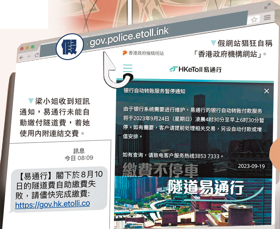 梁小姐收到的短訊內附有一條連結,該網址和易通行官方網址相似,因此她未有為意,「事發後查看才發現略有不同,後面多咗幾個字母。」她點擊該連結的網站,頁面設計也與易通行官網一致,「個網站設計一樣,但部分字係簡體,我當時有一瞬間猶疑,但都覺得20元,唔好爭人錢,因此繼續付款操作。」