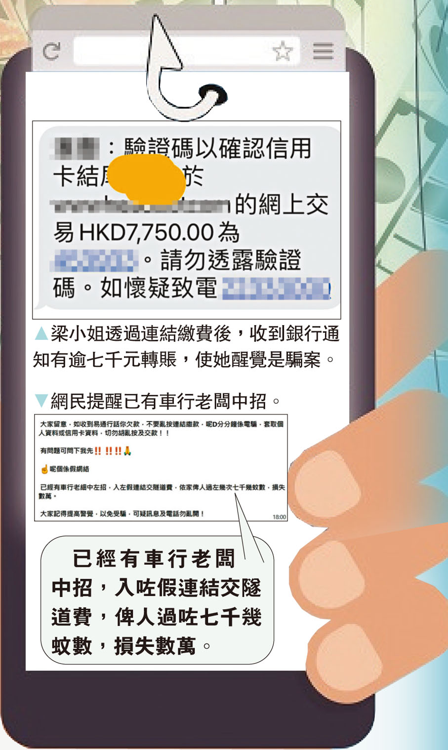 香港特區政府運輸署為方便駕駛人士而推出不停車繳費系統易通行,卻被騙徒偽冒利用作行騙。有車主近日收到騙徒偽冒易通行發出手機短訊,聲稱一筆20元隧道費未能自動繳交,必須按短訊內連結另行繳付,車主遂按指示輸入信用卡資料和驗證碼後,不久就接獲銀行短訊通知有一筆7,750元交易已處理,車主才知「中招」,馬上致電銀行叫停過數,惟銀行表示必須證明她確實被騙才能終止交易。受害車主向香港文匯報投訴表示:「已經提供報案證明,為何銀行還不能終止交易?明明錢還在銀行手上,為何不可以終止損失呢?」◆香港文匯報記者 廣濟