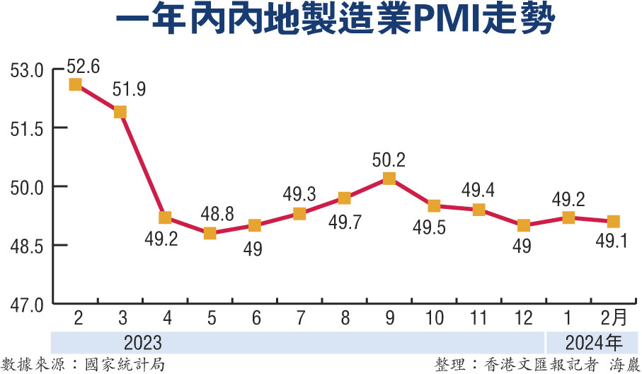香港文匯報訊(記者 海巖 北京報道)受春節假期影響,製造業處於傳統生產淡季,疊加企業員工返鄉增多,國家統計局最新發布的2月製造業採購經理指數(PMI)錄得49.1%,較1月小幅回落0.1個百分點,節日出行和消費則推高當月服務業PMI至近半年高點。專家表示,目前經濟總體保持擴張,顯示回升跡象,但需求不足等問題仍然突出,促消費擴需求等政策有待進一步夯實。