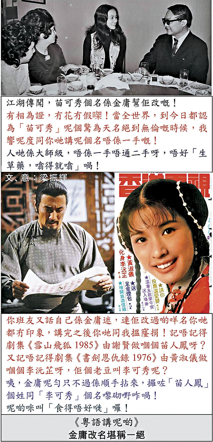雖然金庸用上了「苗人鳳」的姓氏和「李可秀」的名字拼湊出「苗可秀」這個藝名;但事實擺在眼前,取名「苗可秀」完全切合情境與願境,屬天作之合之選。