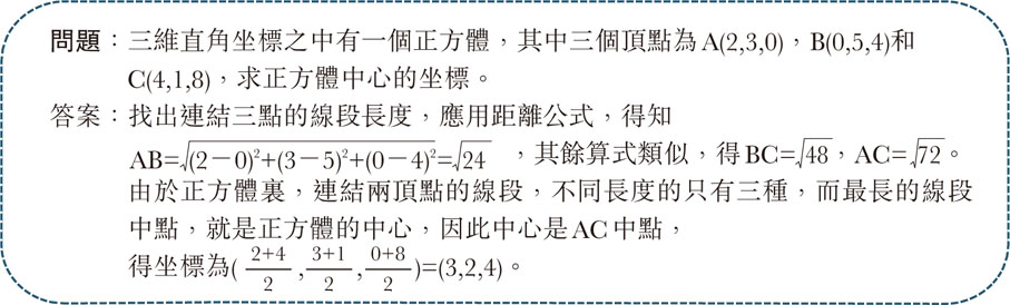 另外也可以探索一下題目的條件,比如問起平常正方體上三個頂點的坐標,是不是就計得出中心來呢?這個找中心的問題,背後有個更基本的問題,就是這個正方體是不是只有一個?這個也不是必然的,比如三個頂點的坐標,剛好就在正方體同一個表面上,那樣三點也只能決定這個表面的位置,可能的正方體卻有兩個,中心也有兩個。