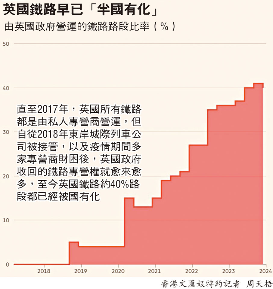 英國基建老化落後問題嚴重,鐵路更是重災區之一,預計很大機會在年底大選後執政的在野工黨,早前就承諾要在上台後的5年內將全國鐵路國有化,目標是要提升鐵路服務質素、降低票價。不過英國鐵路發展積弱多年,不少問題早已是沉痾難治,單單靠國有化真的能夠救得了英國鐵路?◆香港文匯報訊特約記者 周天梧 倫敦報道