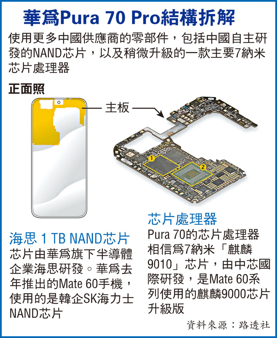 香港文匯報訊 中國電訊商華為上月18日發布最新款智能手機「Pura 70」系列。路透社周四(5月9日)引述獨立分析稱,該系列不但配置中國企業自主研發的7納米芯片,其採用的中國供應商生產零部件,也較過往機型更多,當中包括關鍵的快閃記憶體NAND芯片,以及經過改進的芯片處理器。報道分析相信,在美國對華技術打壓圍堵之際,這一發現表明中國在技術自主化方面正在取得進展。