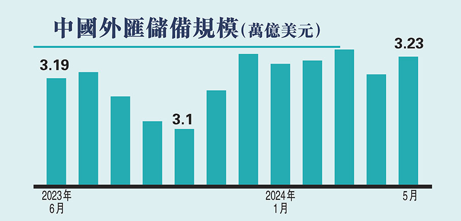 美元弱勢、加上資本流入,逆轉了國家外匯儲備上月大幅下降的態勢。國家外匯管理局昨日發布數據顯示,2024年5月末中國外匯儲備規模為32,320億美元,較4月末上升312億美元,單月增幅創年內最大。而4月份外匯儲備單月減少448.3億美元。◆香港文匯報記者 蔡競文