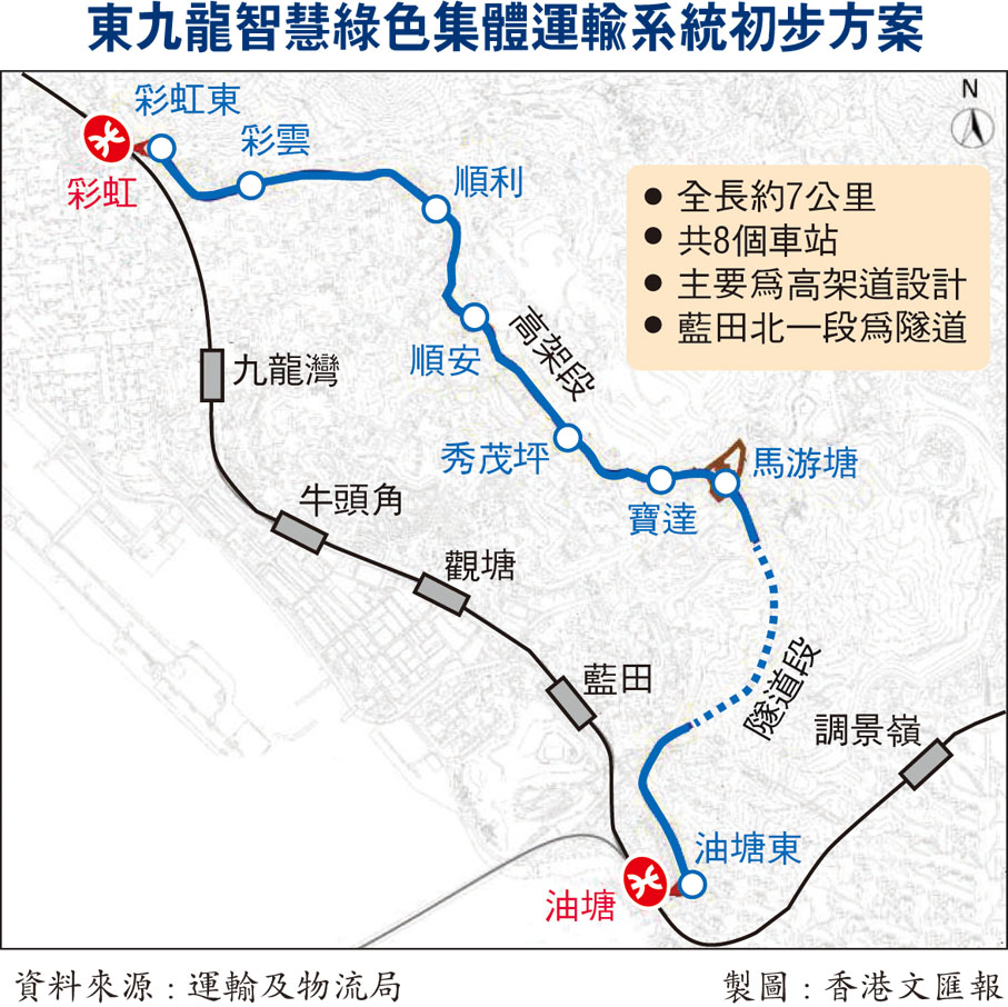 規劃中的東九龍智慧綠色集體運輸系統有8個站,由彩虹東到油塘東,途經順利、秀茂坪及馬游塘等,全長約7公里,運輸及物流局爭取於2026年招標、2027年動工、2033年落成。