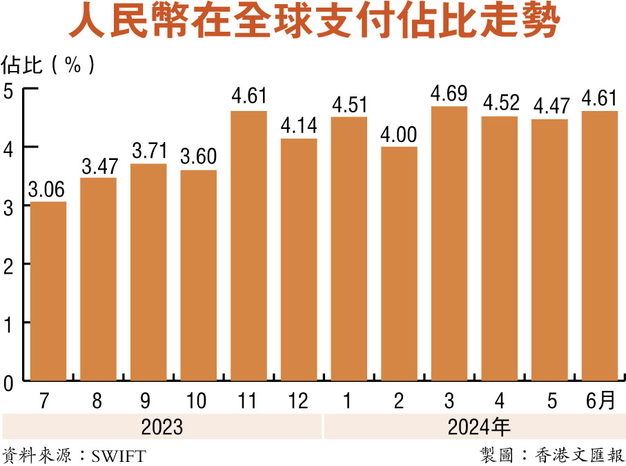 香港作為全球離岸人民幣業務樞紐,本港人民幣資金池規模近年來穩步增長,今年6月底達10,616億元,同比升17%。同時香港在全球離岸市場人民幣支付中的佔比不斷提高,參考今年6月最新SWIFT(環球銀行金融電信協會)數據顯示,離岸市場83%的人民幣支付通過香港進行(2019年以來在75%左右的水平),比例創新高,反映香港人民幣業務輻射全球的作用更加突顯。