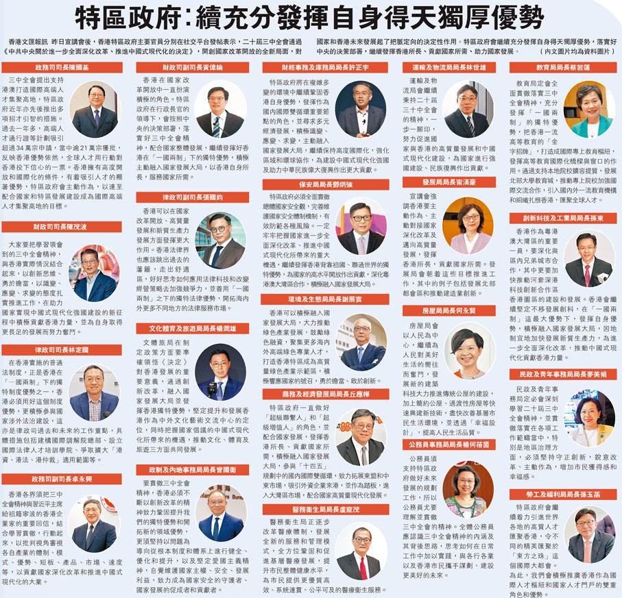 香港文匯報訊 昨日宣講會後,香港特區政府主要官員分別在社交平台發帖表示,二十屆三中全會通過《中共中央關於進一步全面深化改革、推進中國式現代化的決定》,開創國家改革開放的全新局面,對國家和香港未來發展起了把脈定向的決定性作用。特區政府會繼續充分發揮自身得天獨厚優勢,落實好中央的決策部署,繼續發揮香港所長、貢獻國家所需、助力國家發展。