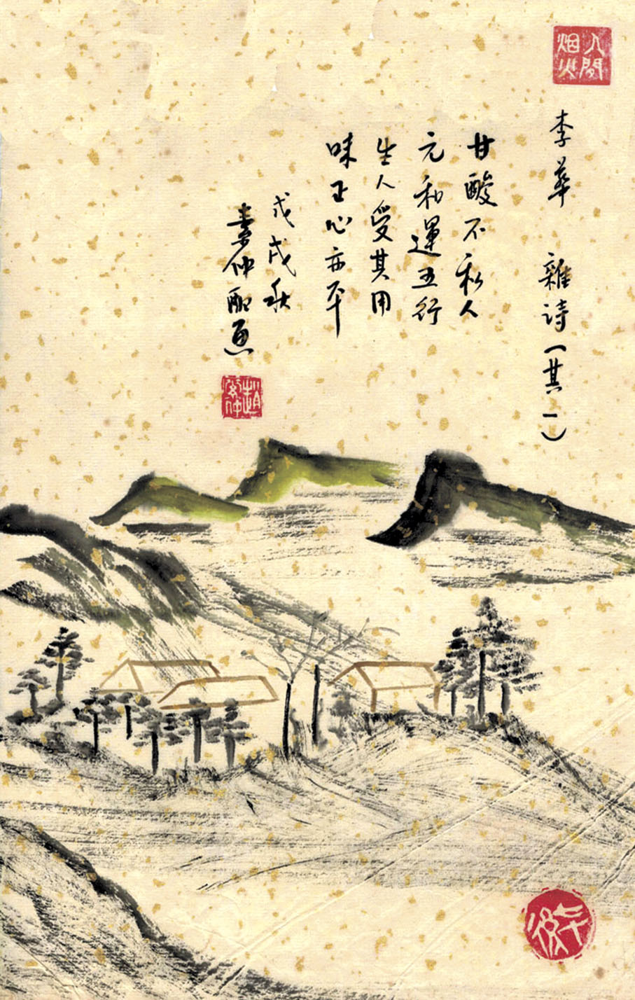 「甘酸不私人,元和運五行。生人受其用,味正心亦平。……聖人不能絕,鑽燧與炮烹。……顏子有餘樂,瓢中寒水清。」李華是唐代著名散文家,《雜詩六首》是他著名的作品。此次選取的這幾句較淺白,其餘的頗為深奧,如道家學問一樣。