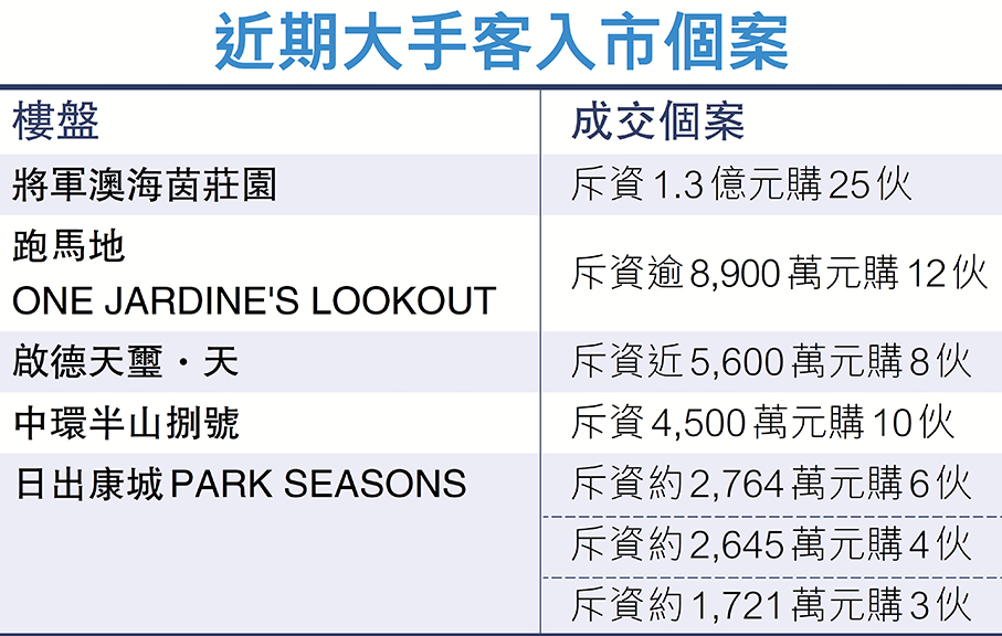 陳永傑指出,中央近期推出「政策組合拳」提振經濟,令港股及樓市同時受惠,上周末一手成交近470宗,已創6個月新高。本月首12天一手成交量達1,233伙,更超越上月全月的743伙。市場憧憬本周三特區政府公布的新一份《施政報告》,將有振興經濟及樓市措施,料可為樓市帶來新一輪助力,陳永傑及布少明均預計,10月份一手成交可達2,500宗,創今年3月後的7個月新高。