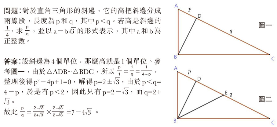 題解裏設斜邊為4個單位,那樣把q用p表示後,再發現了相似三角形關係,就找到了關於p的一元二次方程,之後留意到p較短,就找到了相應的q,然後找到兩者之比。
