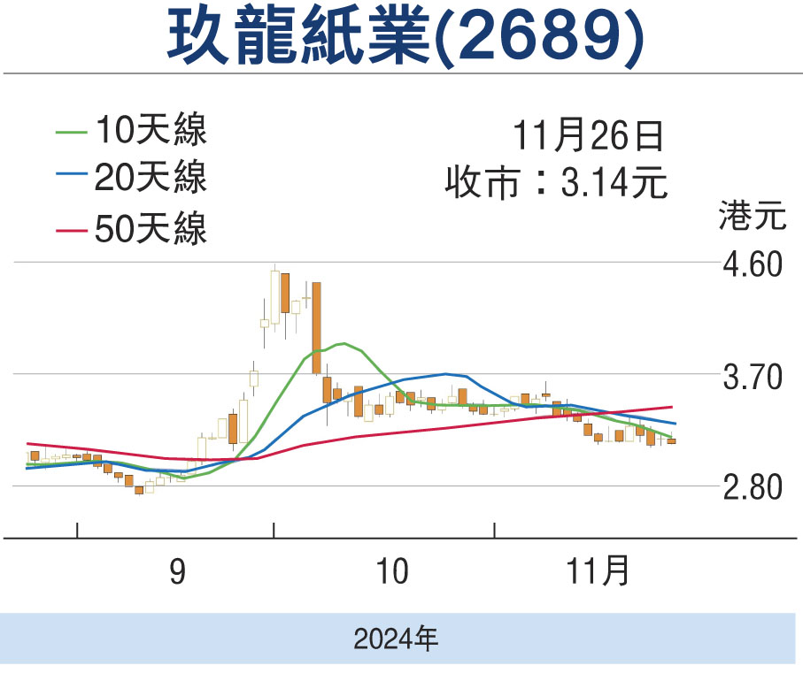 另一方面,造紙龍頭之一的晨鳴紙業(1812)因18億元債務逾期引致其部分銀行賬戶資金被凍結,生產受影響,11月以來相當於七成產能停產,間接影響了市場供需,對玖紙等行業產銷有利。