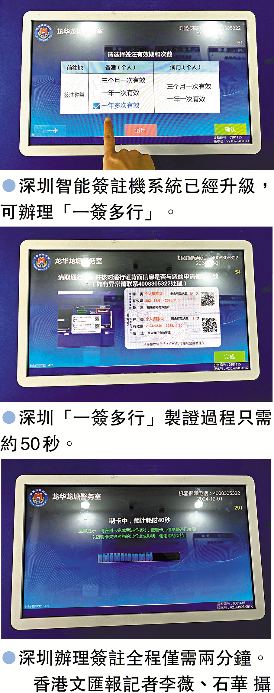 儘管深圳出入境服務大廳處於休息狀態,但多個智能簽註機設備點昨日卻迎來了絡繹不絕的深圳居民。尹先生恰好計劃於11月底續簽即將到期的赴港旅遊簽(一周一行),得知「一簽多行」措施後特意改為昨日辦理。他事先在深圳公安公眾號上查詢了智能簽註點的位置,並選擇了最近的設備點,僅步行10分鐘便到達龍塘警務室的智能服務點,簽註的操作流程也非常迅速。他說:「與以往辦理『一周一行』大同小異,我只需將港澳通行證放入智能簽註機,再按照屏幕上的提示進行操作,不到兩分鐘便完成了,簽註費用為80元人民幣。」