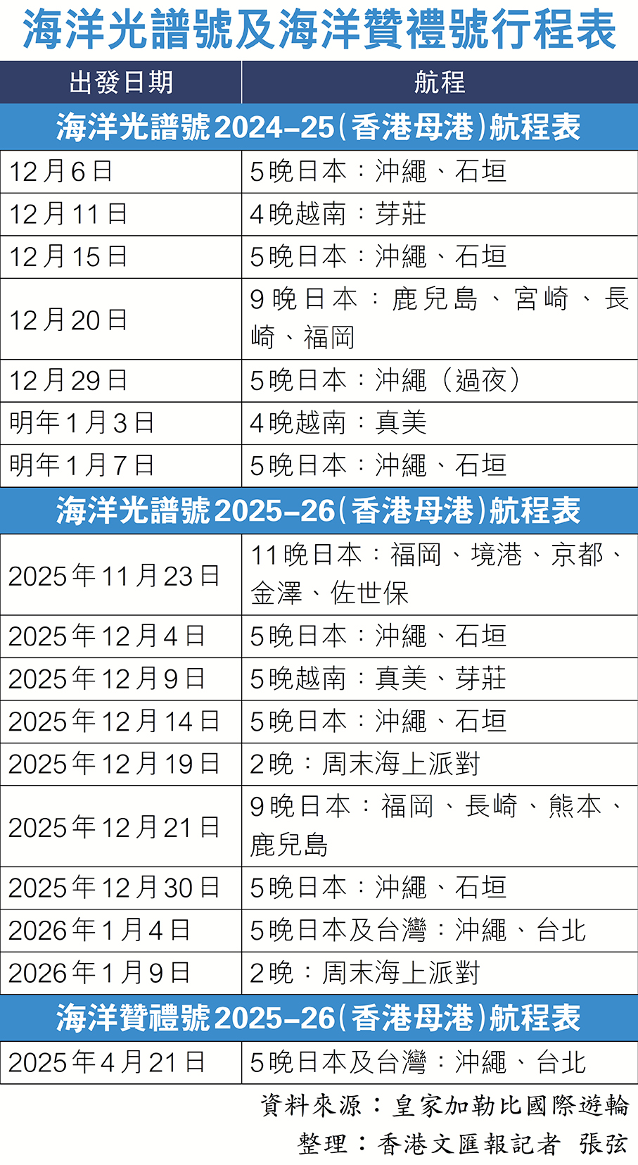 皇家加勒比國際遊輪公司在本月至明年1月期間將以香港作為季節性母港,該公司旗下的「海洋光譜號」昨日抵港,並舉行了「海洋光譜號」回歸香港慶祝活動。該公司負責人表示,他們於本月會提供5個從香港出發的航次,預計未來兩個月將帶來超過兩萬名海外遊客參加香港母港航次。皇家加勒比國際遊輪明年全年的香港母港航次亦增加一倍至10個,更表示正部署2026年開辦更多以香港作為母港的航線。該公司負責人表示,香港一直是重要市場,以香港作為母港是具策略性的決定。出席活動的香港特區政府財政司副司長黃偉綸表示,隨着深圳恢復「一簽多行」入境安排,以及香港機場第三跑道系統啟用,有信心明年的旅遊業前景將更為樂觀。
