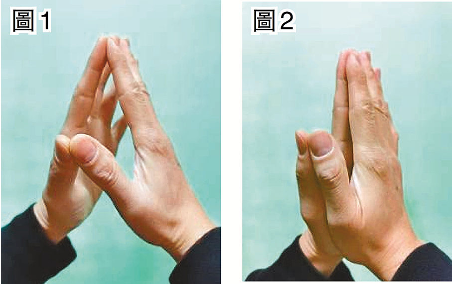 將雙手十指的指腹兩兩相互抵壓,稍用點力(見圖1),注意力放在五對指腹的細膩感觸上,感受其中的壓力、溫度以及指紋的摩挲感,專注2至3分鐘,心就會慢慢靜下來。期間,兩手也可以輕輕開合來變化刺激指頭的感覺。此外,也可以兩掌完全相合,手指相貼,魚際相壓,掌心含虛(見圖2),充分感受兩手豐富的觸感,並將合掌置於胸前,眼觀手指,更是凝氣合十的靜心好方式。