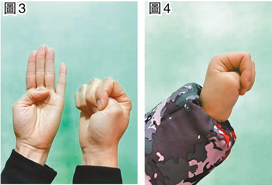 每個人的生活工作當中,難免都會遇到各種煩躁難寧的事,也總會有睡不着覺的時候,此時,我們可以採用握固收心法。此法又被稱之為金剛拳。其做法是:將大拇指收合在手掌心,其餘四指捲曲包裹拇指,稍用點力,如摶握一個寶貝(見圖3、4);注意力隨即觀照大拇指受壓和四指拳握的感覺,專注2~3分鐘,心也就會漸漸靜定下來。握固收心法不僅可以平定內心,還可以收攝精神,使人更富有力量感。