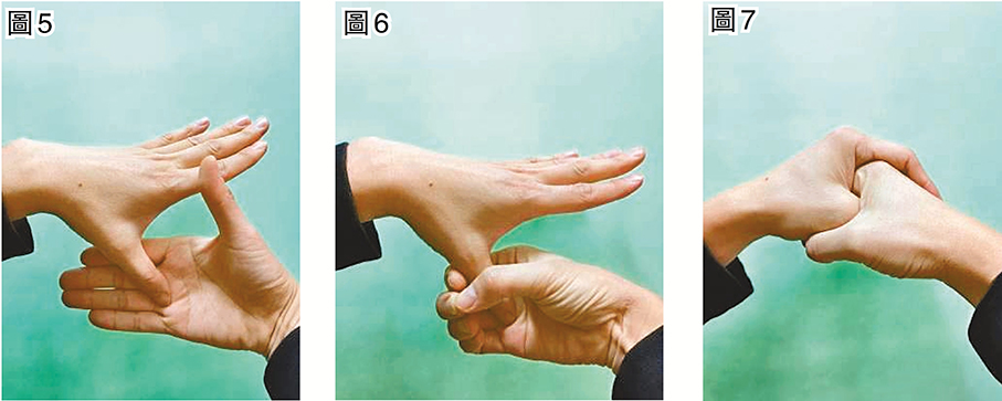 我們的兩手十指竟然蘊含着「天地」的密碼。其中,左手為陽,藏有「十天干」,右手為陰,藏有「十二地支」;右手無名指根部為十二地支的「子」,右手中指指尖為十二地支的「午」。現在,左手大拇指扣壓右手無名指根部的「子」位,右手大拇指扣壓右手中指尖的「午」位(見圖5、6),然後代表「天陽」的左手抱牢代表「地陰」的右手(見圖7);這個手式稱之為「子午扣」。子午扣是人體左右陰陽交合相融的一個手式;不僅指尖相扣和兩手交握的感觸清晰,能讓人專注靜心;更可以感受到自身氣機的摶聚和收攏,從而能讓自己感覺內心回到了溫暖平和的自家身宅當中。平日裏開會聊天看電視,都可以兩手交握子午扣,放置小腹前,來實現收心靜心、休復身心的功效。