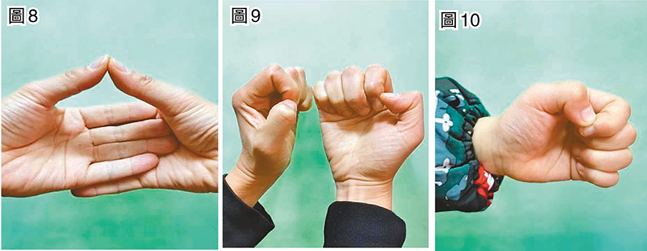 人體十二經脈的「井穴」位於指趾末端,都是一些敏感而容易受刺激的部位,臨床上常用於急救和解除高熱。其中,「商陽穴」為手陽明大腸經的井穴,位於食指末端指甲根靠拇指側的位置。現在,我們用兩手的大拇指指甲尖,分別點壓刺激商陽穴,同時其餘三指稍用力捲握扣抵在手掌上(見圖9、10);此時,我們能清晰地感受到商陽穴較銳利的刺痛和兩手捲握收攝的緊張,這樣注意力就會被集中收攝於手上,心也就會慢慢靜定下來。我們的注意力總是容易被外界吸引,或者內心煩亂時注意力無處安放,我們就可以採用這個「金鎖固心訣」——因為這個手式的造型猶如古代的銅鎖一般牢固堅定。
