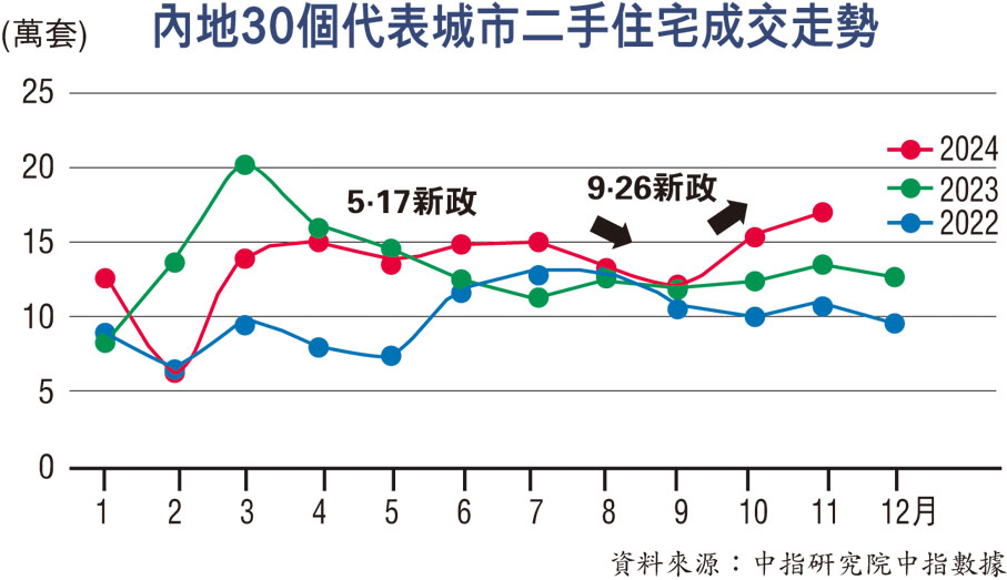 已深度調整三年有餘的內地樓市在2024年下半年迎來了關鍵的政策拐點,9·26中央政治局會議明確提出「要促進房地產市場止跌回穩」,釋放了迄今最強維穩信號,政策目標直指扭轉行業基本面,為市場注入信心。經過2個月新政「組合拳」的落地推進和持續發酵,四季度以來樓市交易活躍、預期改善,特別是核心城市市場明顯回溫。業內專家普遍認為,12月的政治局會議提出「穩住樓市」、中央經濟工作會議強調「持續用力推動房地產市場止跌回穩」,為2025年定下更加堅定的挺樓市基調,在適度寬鬆的貨幣政策背景下,加之止跌回穩各項新舉措的落地,2025年樓市有望繼續改善。●香港文匯報記者 王玨 北京報道