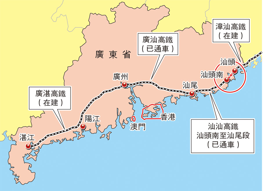 未來,汕汕高鐵全線建成通車後,從汕頭至廣州將縮短至1.5至2小時,將與廣汕高鐵、漳汕高鐵、福廈漳高鐵、溫福高鐵、甬台溫高鐵共同構成國家東南沿海高鐵通道,途經廣東、福建、浙江三省15個城市,打通粵港澳大灣區經粵東、海西經濟區直達長三角的通道,助力國家東部沿海地區高質量發展。