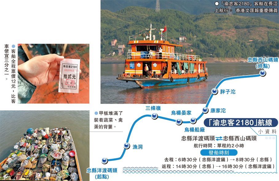 秦大益駕駛的這艘客船名為「渝忠客2180」,是他與合夥人曹利芳在2013年花費約30萬元(人民幣,下同)包下的,專門跑從重慶忠縣洋渡鎮到重慶忠縣縣城的航線。「起初我們生意很不錯,每天至少來回兩趟,忙的時候要往返三趟,加上當時有政府的助農補貼,還是有利潤的。」秦大益告訴香港文匯報記者,不過好景不長,三年後當地的沿江高速公路全線通車,乘客量銳減,「到了2020年,這條原本有十艘船的航線只剩下我們一艘了。」