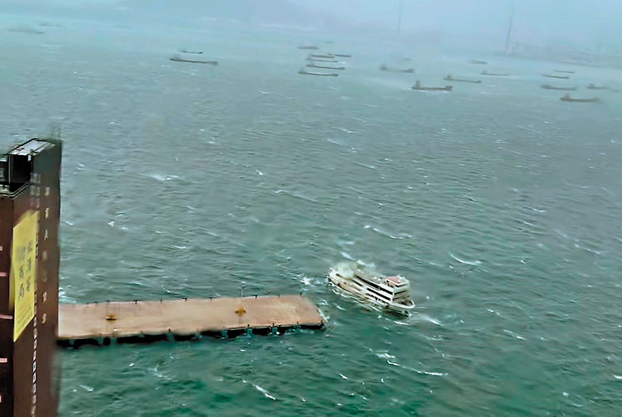 另外,在西環西寧街近招商局碼頭對開海面,昨日上午約10時,十號風球下,一艘輪船疑不敵風浪在海面漂浮,船身撞向碼頭石壆,救援人員到場證實無人受傷。約一小時後,西貢垃圾洲對開海面亦有一船隻疑遭強風吹翻,幸當時船上無人。