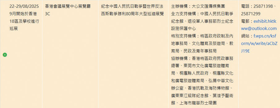 由大公文匯傳媒集團主辦的「銘記歷史 珍愛和平——紀念中國人民抗日戰爭暨世界反法西斯戰爭勝利80周年大型巡迴展覽」將於8月22日至8月29日假香港會議展覽中心3C展廳舉辦。