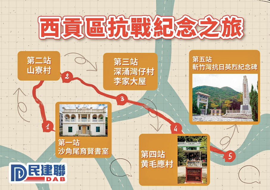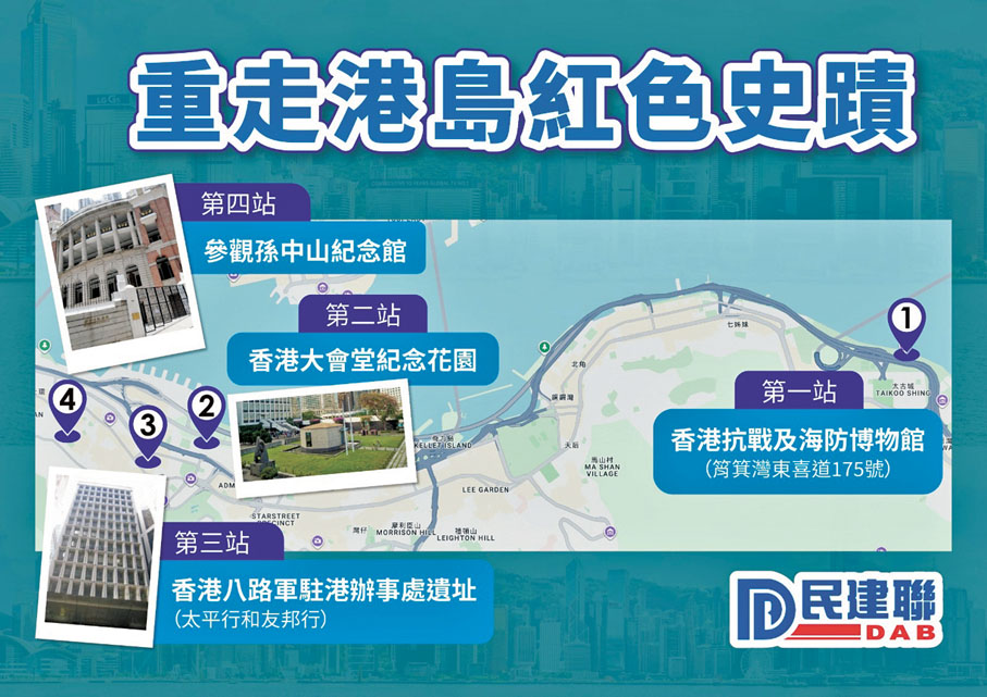 民建聯表示,香港蘊藏着諸多珍貴的愛國主義教育特色旅遊景點,有不少與國家及香港抗戰歷史有關的古蹟或景點,例如被國務院列入第三批80處國家級抗戰紀念設施遺址名錄的斬竹灣抗日英烈紀念碑,以及港九大隊成立地點黃毛應村玫瑰小堂等。同時,香港位於粵港澳大灣區核心,與廣州、深圳等地的愛國主義教育特色旅遊資源(如黃花崗烈士陵園、辛亥革命紀念館)形成天然互補,可打造跨區域愛國主義教育特色旅遊網絡。