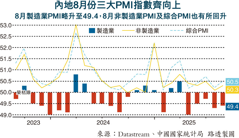 國家統計局昨公布數據顯示,8月,中國製造業採購經理指數(PMI)錄得49.4%,較上月微升0.1個百分點,反映製造業景氣水平有所改善;非製造業PMI則升0.2個百分點至50.3%,連續處於擴張區間;綜合PMI產出指數報50.5%,較前值回升0.3個百分點,顯示企業生產經營活動總體擴張步伐加快。國家統計局服務業調查中心高級統計師趙慶河解讀稱,三大指數均見回升,反映中國經濟景氣水平總體保持擴張態勢。●香港文匯報記者 馬翠媚